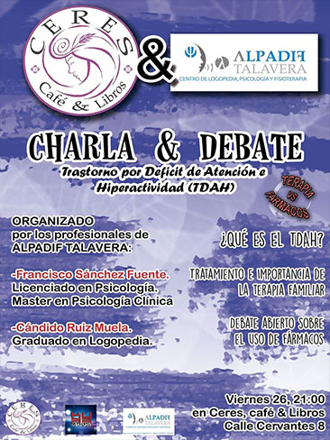 Primera Charla-Debate sobre TDAH " Tratamiento: Terapia Vs Medicación" dirigido a profesionales de la enseñanza, padres y madres y a todos los interesados en la materia. Próximo viernes 26 de junio en Ceres café & libros.