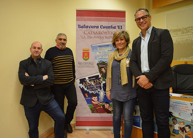 La concejal de Educación, María Victoria González Vilches, junto a Luis Dionisio Dégano, Javier García, ilustrador de los libros, y Rubén Martin, de la Asociación La Barbacana, han presentado la sexta edición del programa de animación a la lectura "Talavera Cuenta", una iniciativa de la concejalía de Educación con la que, se pretende fomentar la lectura entre los escolares de la ciudad y promocionar la historia, la personalidad y la identidad de Talavera a través de libros de autores locales que trabajan sobre la historia, el patrimonio, las tradiciones y la cultura de la ciudad.