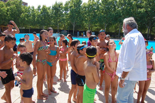 El alcalde ha visitado a los alumnos participantes en el programa Campamentos Urbanos, que en la mañana de hoy han compartido y participado en diversas actividades y juegos de verano en la piscina municipal La Piedad.