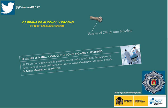 La Dirección General de Tráfico ha puesto en marcha, del 12 al 18 de diciembre, una nueva CAMPAÑA DE CONTROL DE ALCOHOLEMIA Y DROGAS, a la que se ha adherido el Ayto. de Talavera de la Reina, a través de la Concejalía de Protección Ciudadana y Movilidad y que se desarrollará por la Policía Local y Agentes de Movilidad, para reducir el número de conductores que utilizan vehículos con tasas de alcoholemia prohibidas y/o drogas.