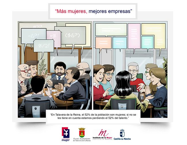 Desde el Centro de la Mujer se enviarán cuatro correos en los aparece una ilustración “que ayudará a las empresas a identificar de una forma visual e impactante el mensaje de sensibilización que pretendemos transmitir”. Hoy, 11 de septiembre, se ha enviado el primer mensaje, cuyo eslogan es “Más mujeres, mejores empresas”, y “tratamos de mostrar la importancia que tiene la presencia de mujeres en puestos de responsabilidad”.