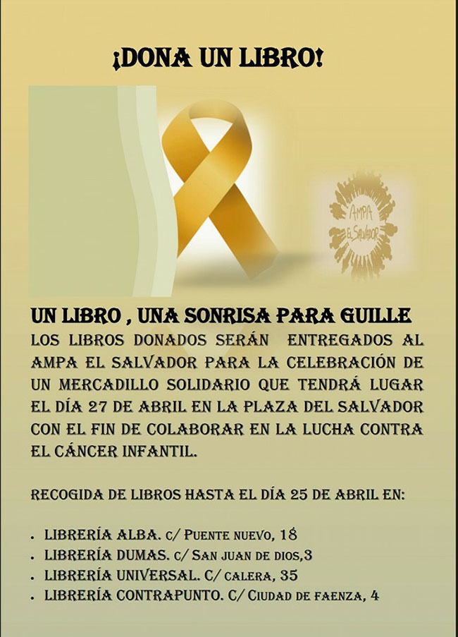 Él AMPA del colegio Juan Ramón Jiménez pone en marcha , en colaboración con el centro , la recogida de libros usados con el fin benéfico de organizar un mercadillo solidario en la plaza del Salvador el 27 de abril. Con este acto se quiere seguir apoyando a Guille , alumno del centro.