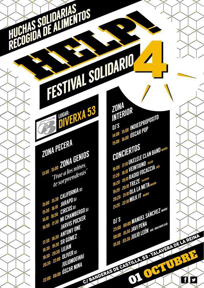 El próximo sábado día 1 de Octubre desde las 13.00 horas dará comienzo la cuarta edición del festival solidario Help! En la sala Diverxa Cult 53 de Talavera de la Reina.