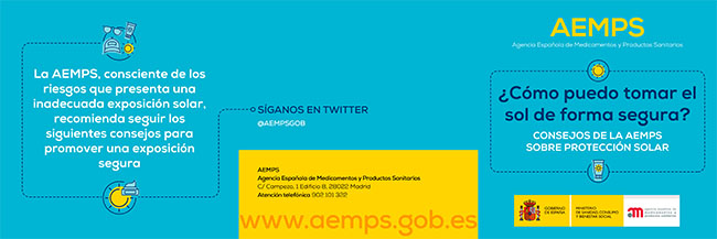 Consciente de los mencionados riesgos, la Agencia Española de Medicamentos y Productos Sanitarios (AEMPS), adscrita al Ministerio de Sanidad, Consumo y Bienestar Social, insiste en un decálogo de recomendaciones generales que busca promover una exposición solar segura y fomentar el buen uso de los cosméticos: