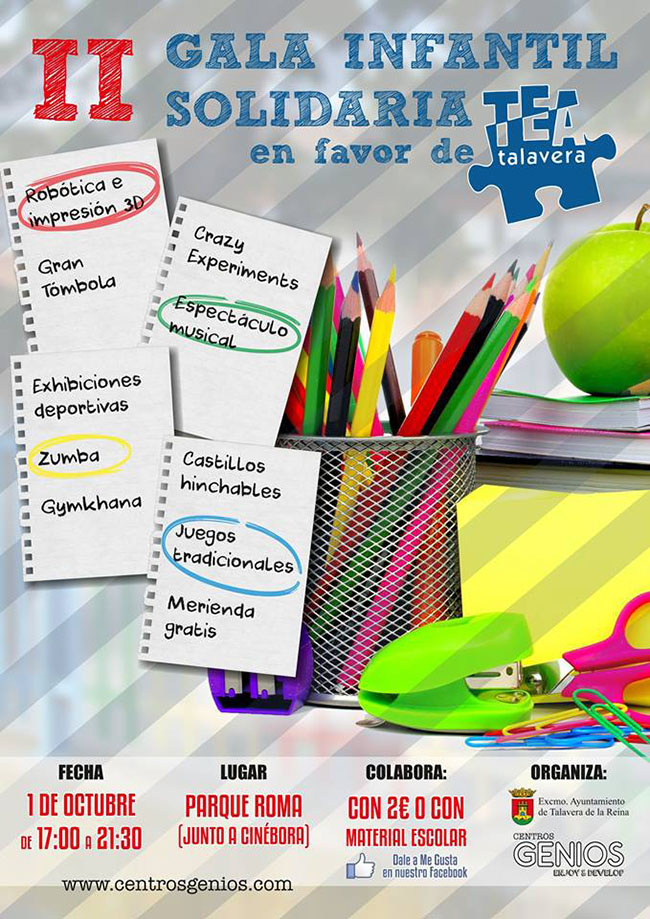 El consistorio colabora con esta Gala Infantil Benéfica que se celebrará el 1 de octubre, a partir de las 17:00 horas, en el Parque Roma y que organiza el grupo Genios para recaudar material escolar y fondos para los proyectos de Tea Talavera, entidad que da atención a los niños afectados por el trastorno del espectro autista.
